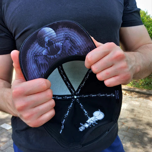 Grim begleitet verlorene Seelen ins Jenseits. Große Flügel, kein Gesicht. Dunkle Symbolik in ihrer stärksten Form – jetzt als Curved Cap.