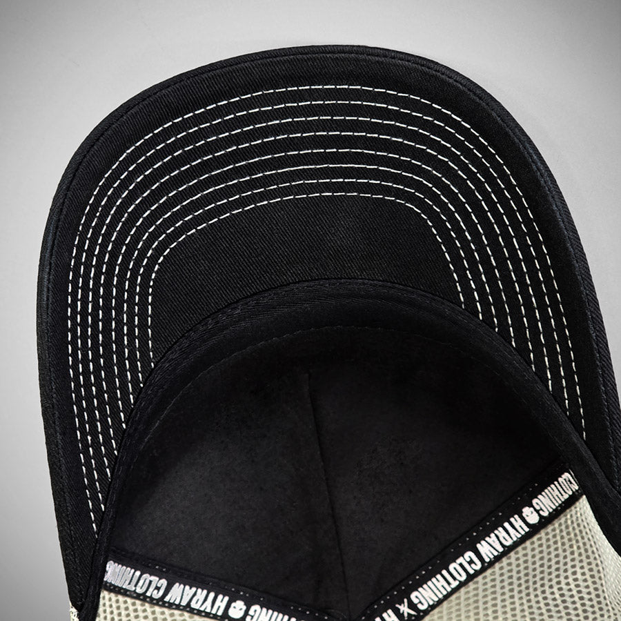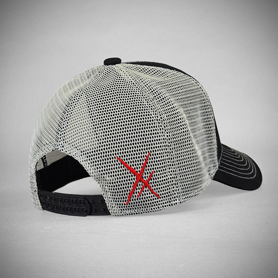 WINTER 2025 Kollektion – Graue Trucker-Cap mit schwarzem, gebogenem Schirm und weißer Ziernaht. Auf der Vorderseite befindet sich ein gestickter FURY-Patch, unter dem Schirm ist das FURY-Motiv aufgedruckt, und auf der Rückseite ist die Hyraw Cross-Signatur eingestickt.