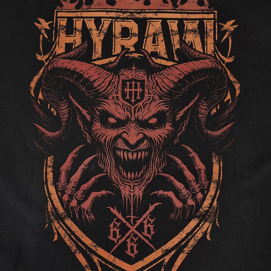 Schwarzer Hoodie mit Kängurutasche. Mit dem TEAM 666-Design auf dem Rücken, dem Hyraw-Patch über dem Handgelenk am linken Ärmel und dem HYRAW-Logo auf der Brust. Schlicht, effektiv und kompromisslos!