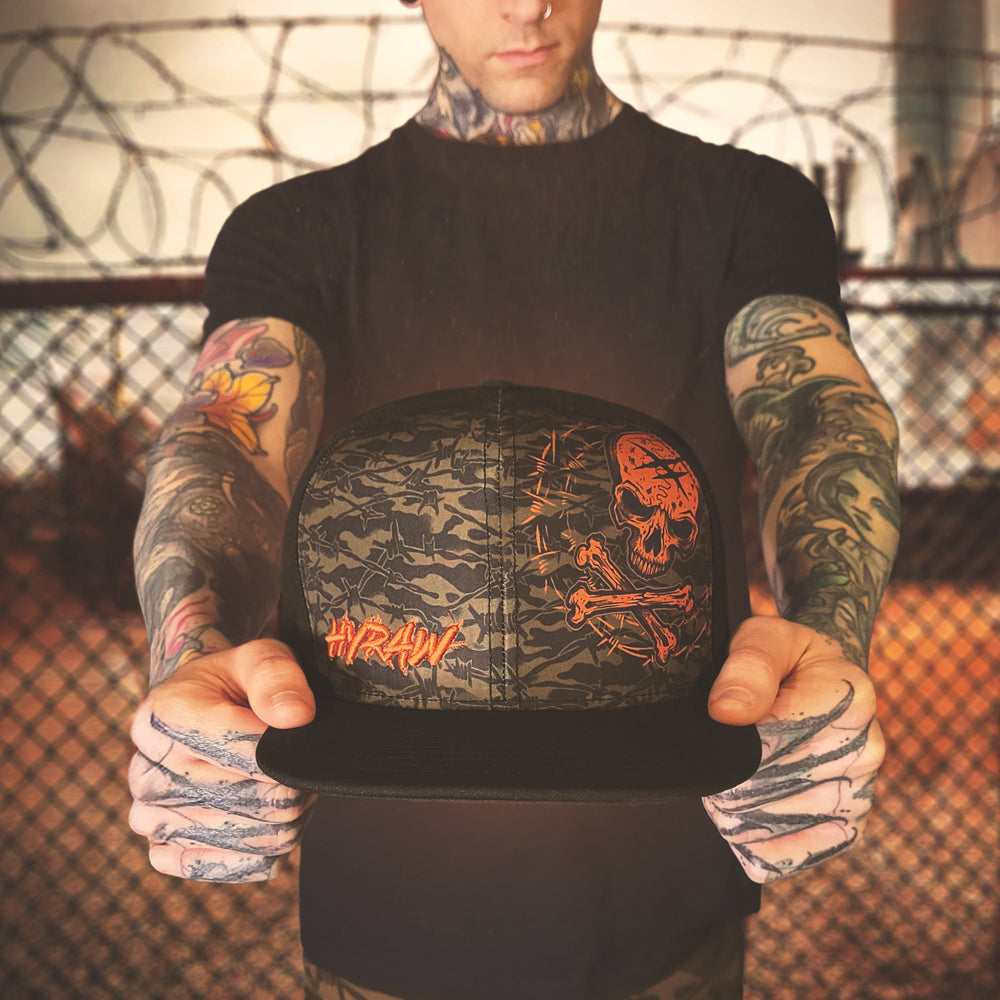 Schwarze Baseballcap mit flachem Schirm, BARBED-Khaki-Camouflage-Muster und „Barbed Skull“-Wappen in Orange auf der Vorderseite. Orangefarbene, geprägte HYRAW-Logo-Stickerei auf der Front, Stacheldraht-Muster in Orange unter dem Schirm gedruckt und „Hyraw Cross“-Signatur in Orange auf der Rückseite eingestickt.